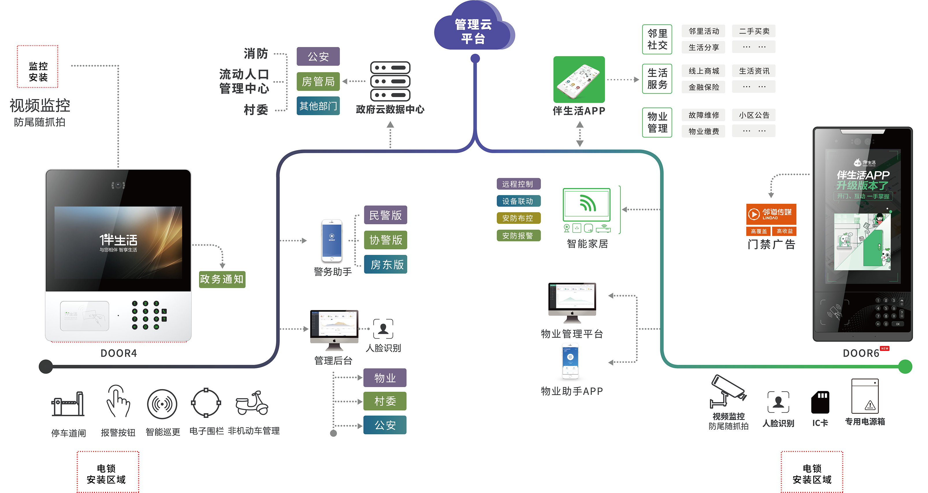 手机APP视频对讲、一键开锁、人脸识别、访客抓拍,物业公告通知、社区周边优惠信息推送接收。